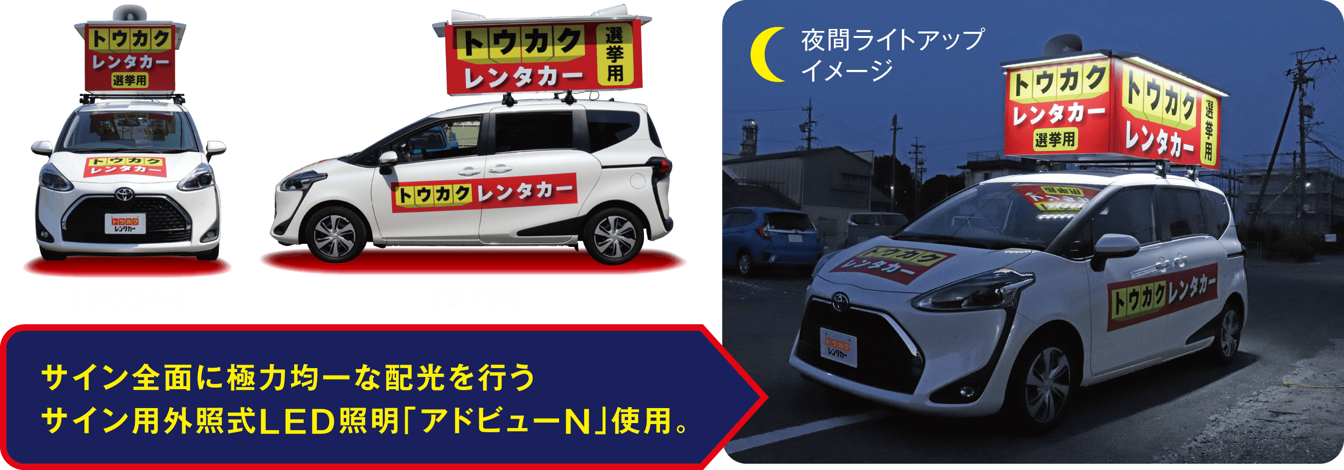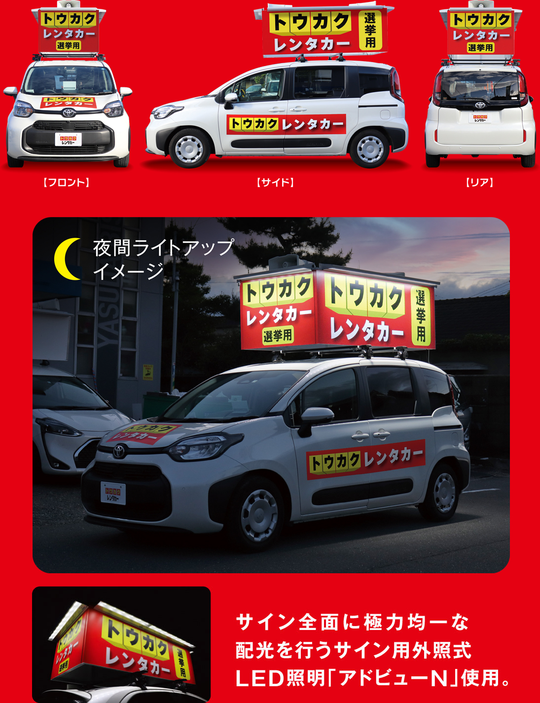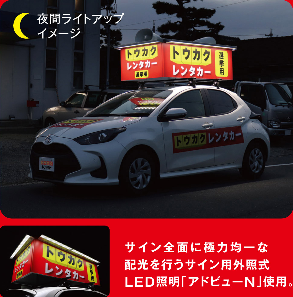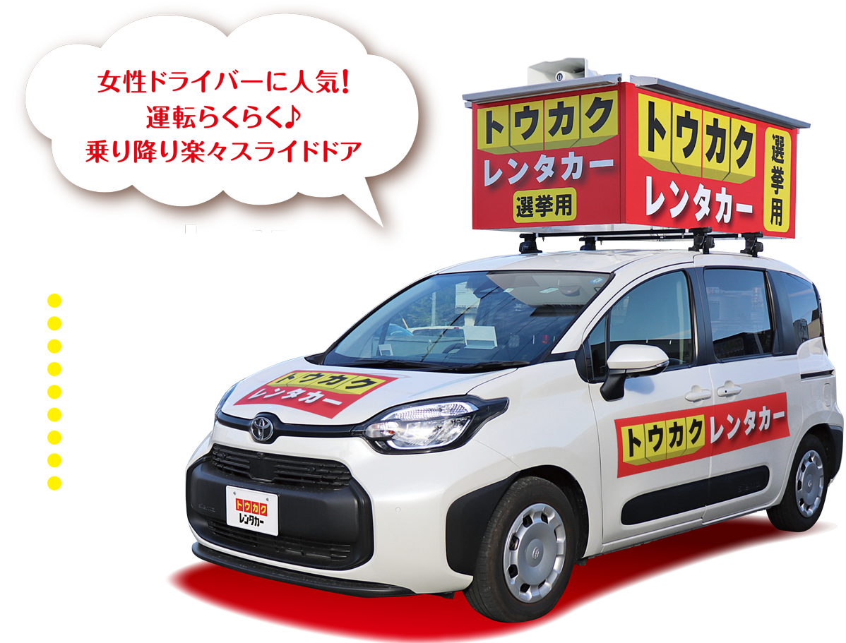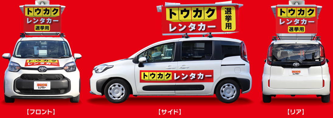 ※上記金額は、一般的な市議会議員選挙での自己負担額です。 ※レンタカー代金(公費負担112,700円)は、別途当社から選管にご請求させていただきます。 ※公費負担額は、各都道府県市町村によって異なりますので、それにより自己負担額も異なります。 ※無投票となった際は上記金額+公費負担1日分となります。 ※無投票の場合は告示日の翌日引取となります。
