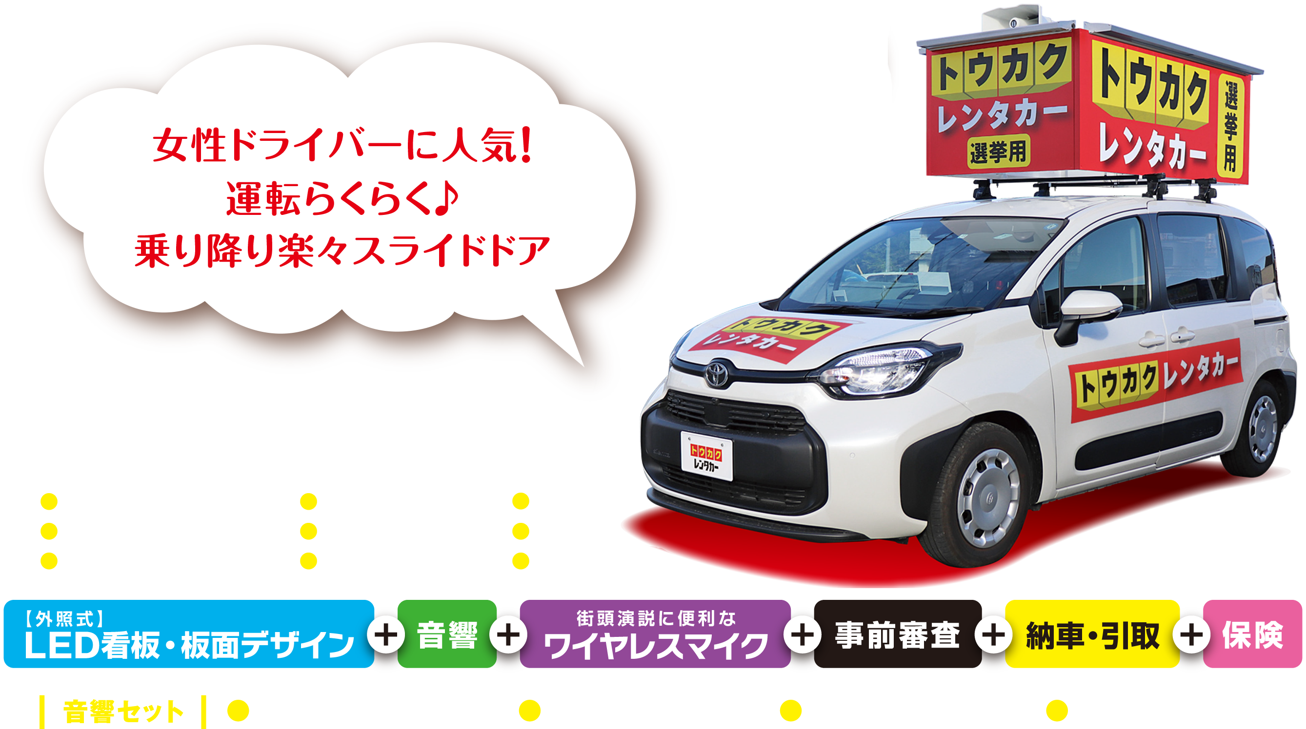 過酷な使用環境にある選挙カーを選挙期間中、安心してご利用いただけるよう細やかな整備を施しています。万一、トラブル対応が必要な場合は、お電話1本で誠心誠意対応いたします。